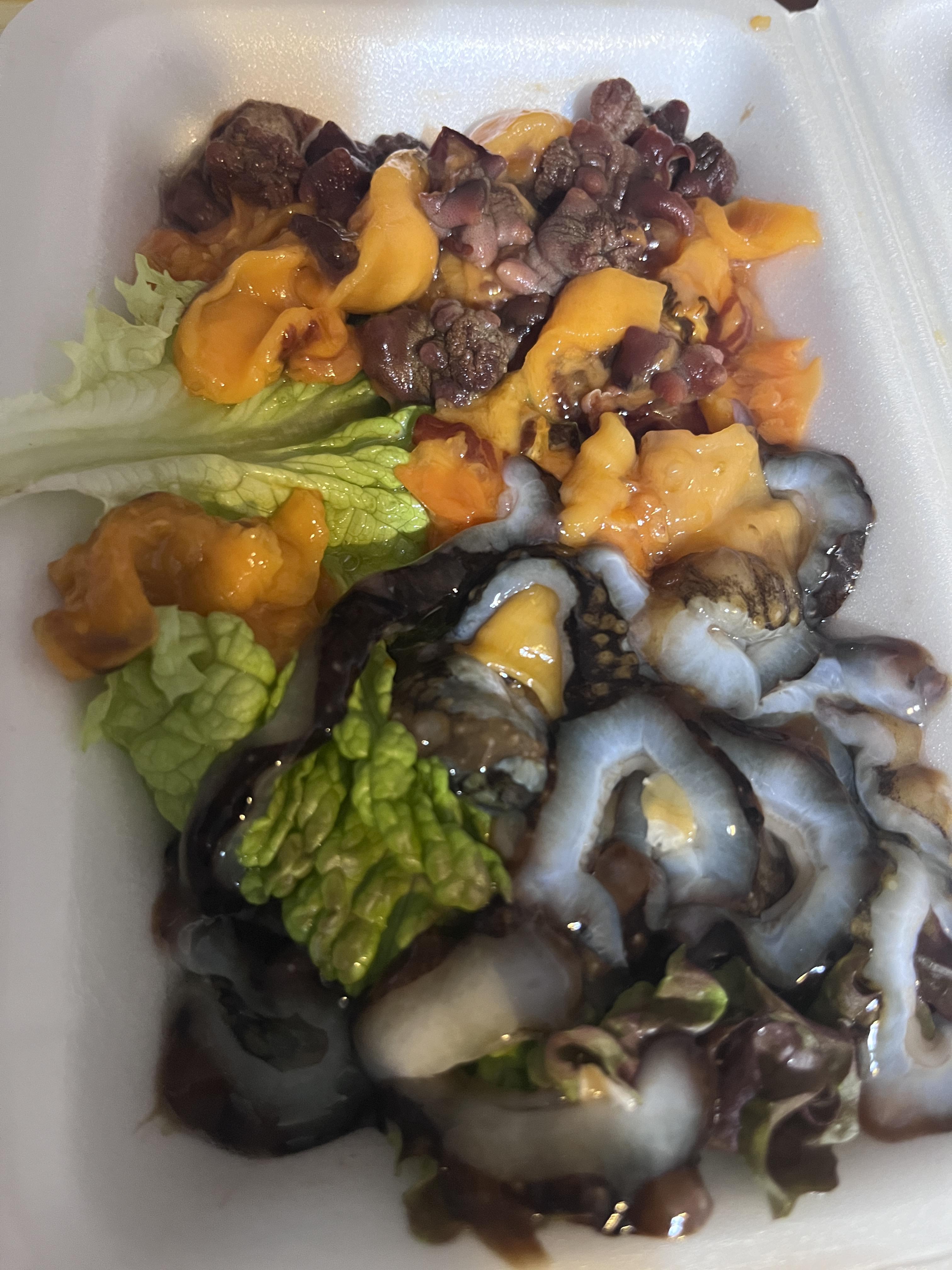 바다의 향이 많이 느껴지는 멍게는 붉은 색으로 꼭지 모양이 오돌토돌하게 있어 바다의 파인애플이라 불립니다. 딱딱한 껍질을 벗겨내면 주황빛 도는 멍게 살이 있습니다.